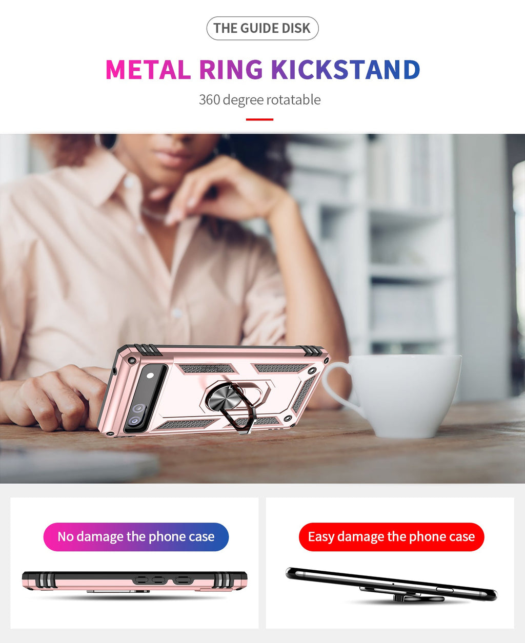 360 degree rotatable aluminum alloy ring kickstand on the Google Pixel 6a Case allows for the optimal viewing position