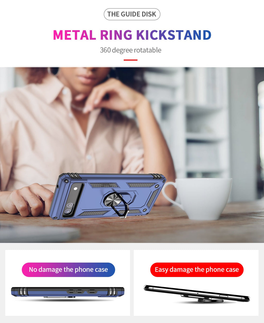 360 degree rotatable aluminum alloy ring kickstand on the Google Pixel 6a Case allows for the optimal viewing position