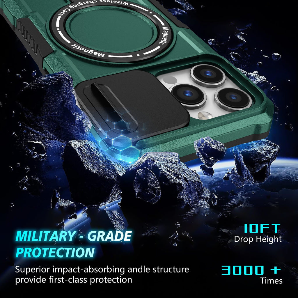 Quality MagSafe Compatible Magnetic Ring Heavy Duty Kickstand iPhone 13 Pro Case with Rear Camera Sliding Cover