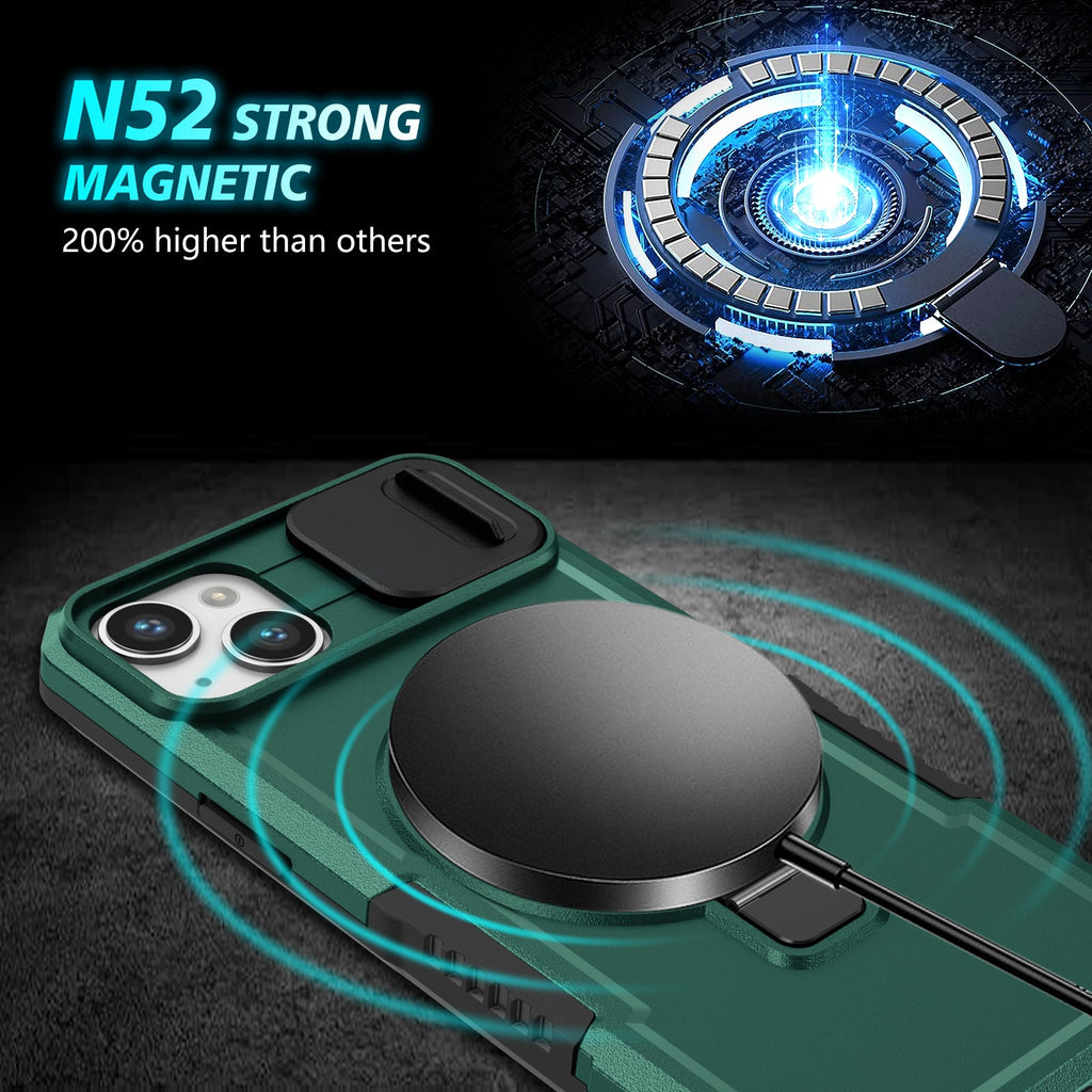 Quality MagSafe Compatible Magnetic Ring Heavy Duty Kickstand iPhone 14 Plus Case with Rear Camera Sliding Cover
