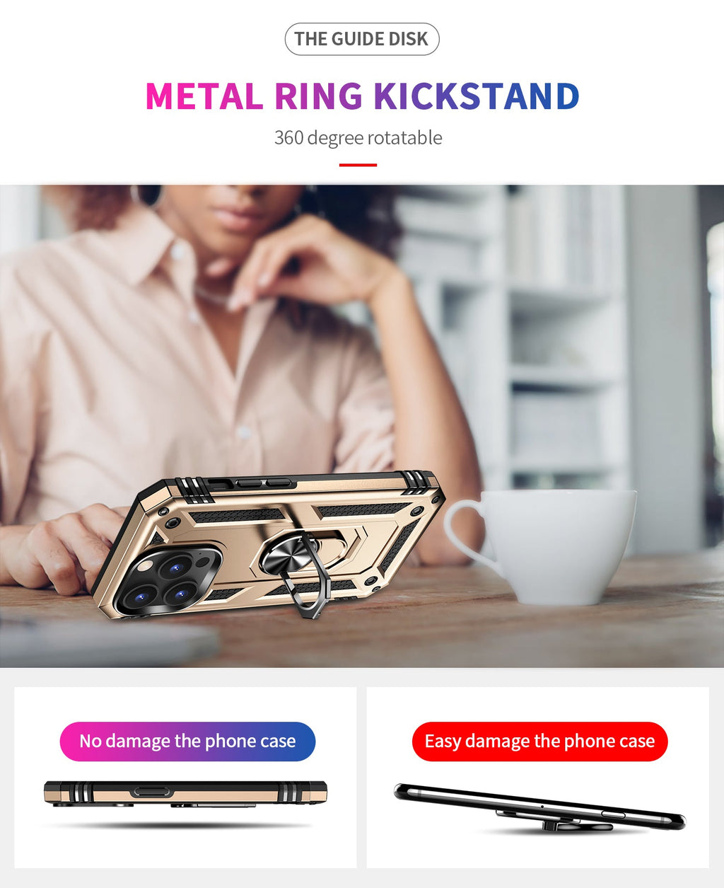 360 degree rotatable aluminum alloy ring kickstand on the iPhone 14 Pro Max Case allows for the optimal viewing position