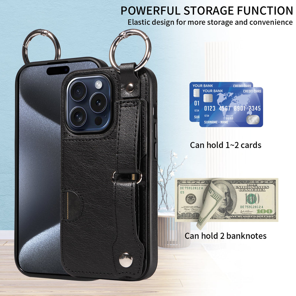 Quality PU Leather Single Card iPhone 15 Pro Case with Hand Strap