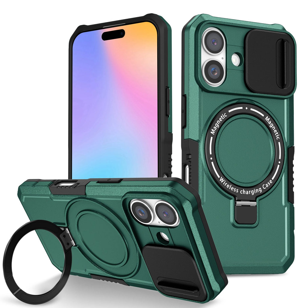Quality MagSafe Compatible Magnetic Ring Heavy Duty Kickstand iPhone 16 Case with Rear Camera Sliding Cover