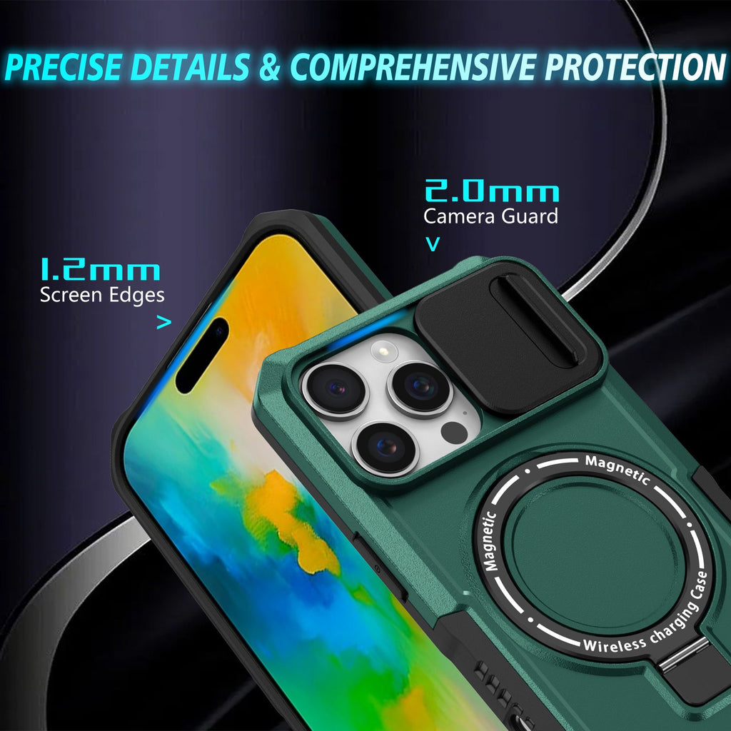 Quality MagSafe Compatible Magnetic Ring Heavy Duty Kickstand iPhone 16 Pro Max Case with Rear Camera Sliding Cover