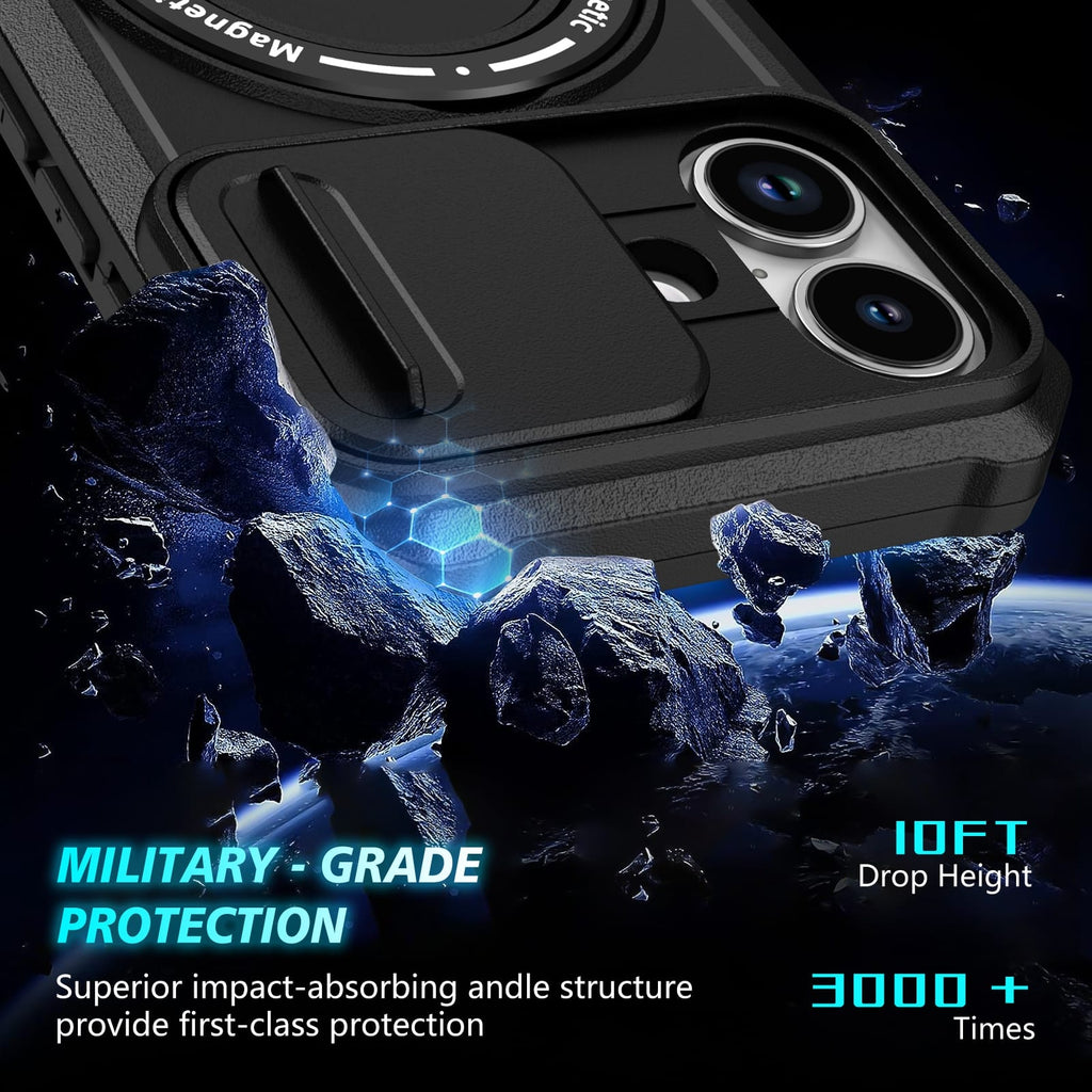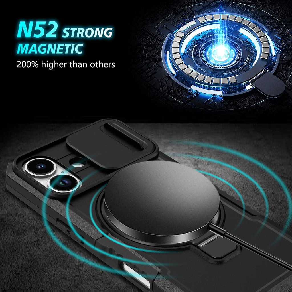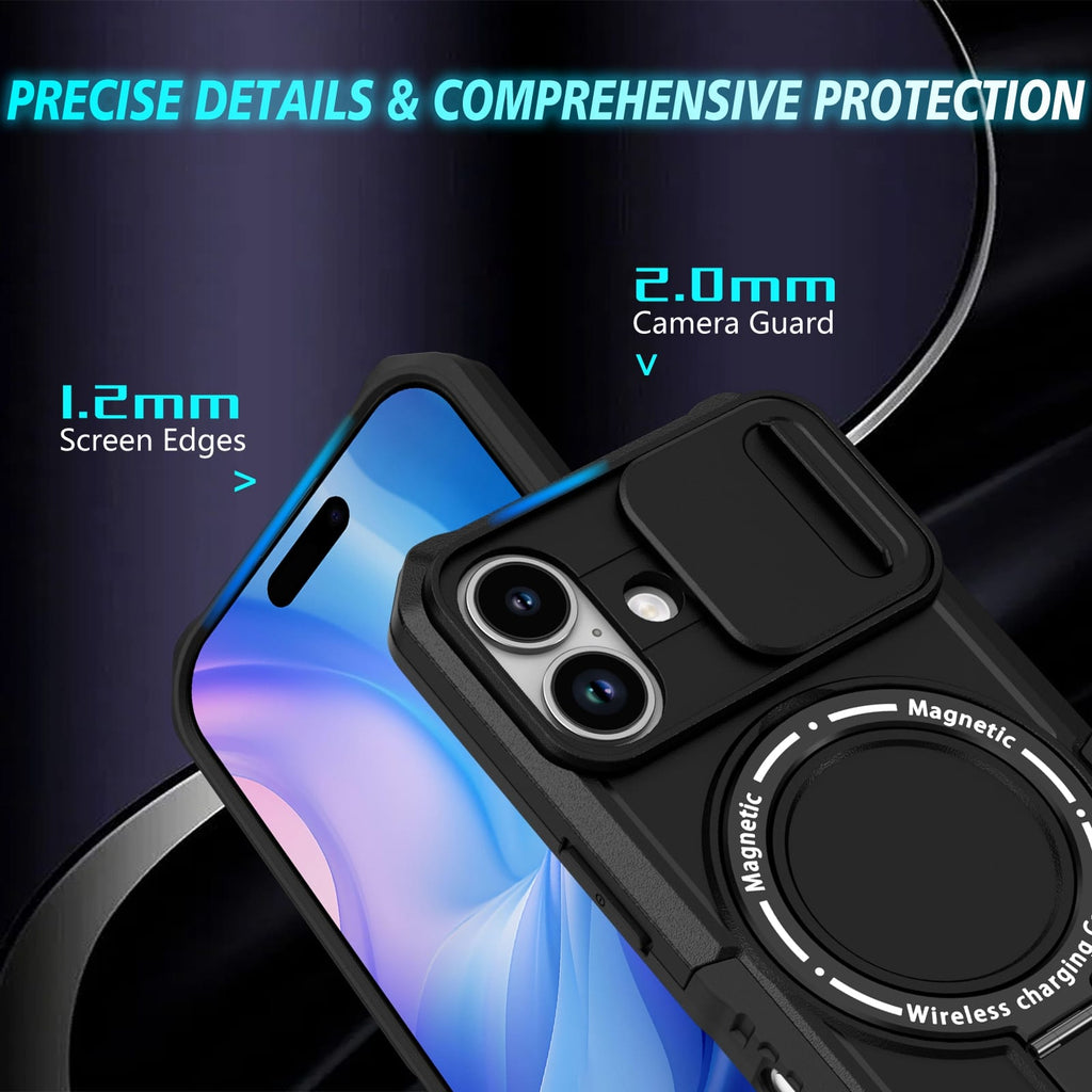 Protect your iPhone with this tough yet stylish case. Featuring a built-in magnetic ring stand, sliding camera cover, and reinforced drop protection, it’s designed for everyday use while staying compatible with all your MagSafe accessories.