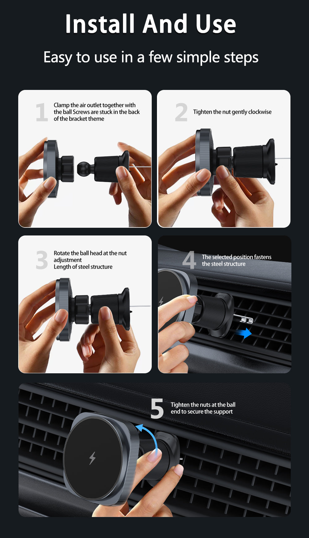 360 Degree Rotation: The newest design of air vent clamp, so that you can clamp the charger on the car tightly. Providing 360 degree optional angles.