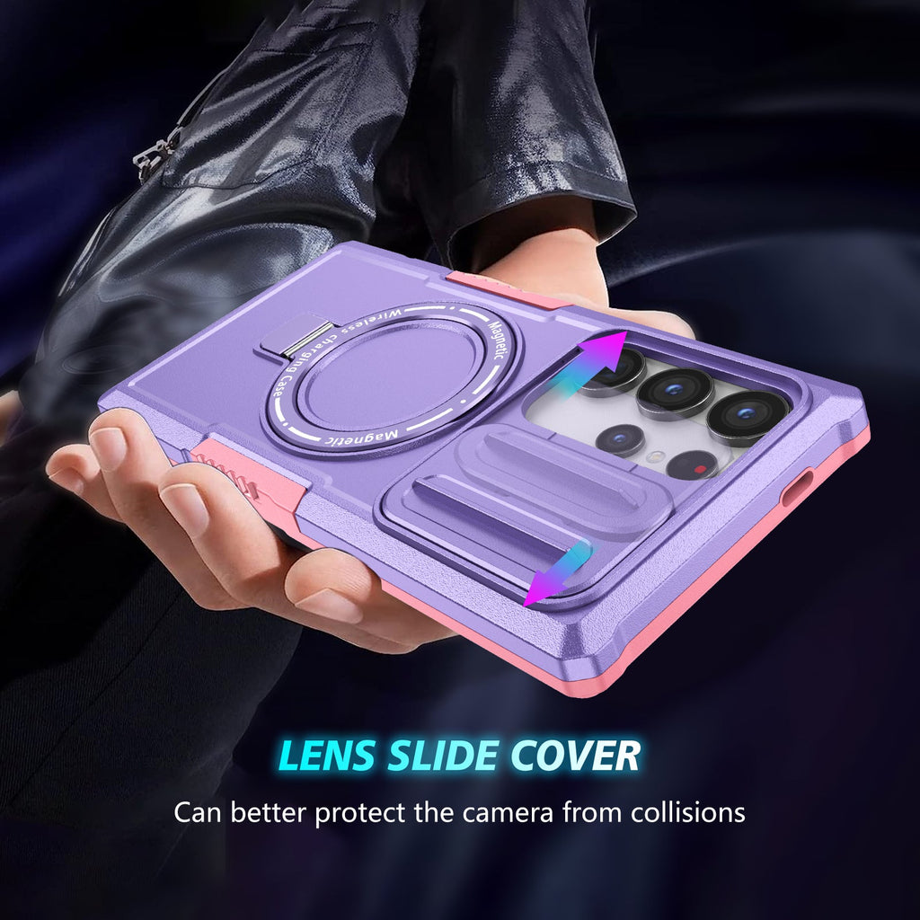 Quality MagSafe Compatible Magnetic Ring Heavy Duty Kickstand Samsung Galaxy S24 Ultra Case with Rear Camera Sliding Cover