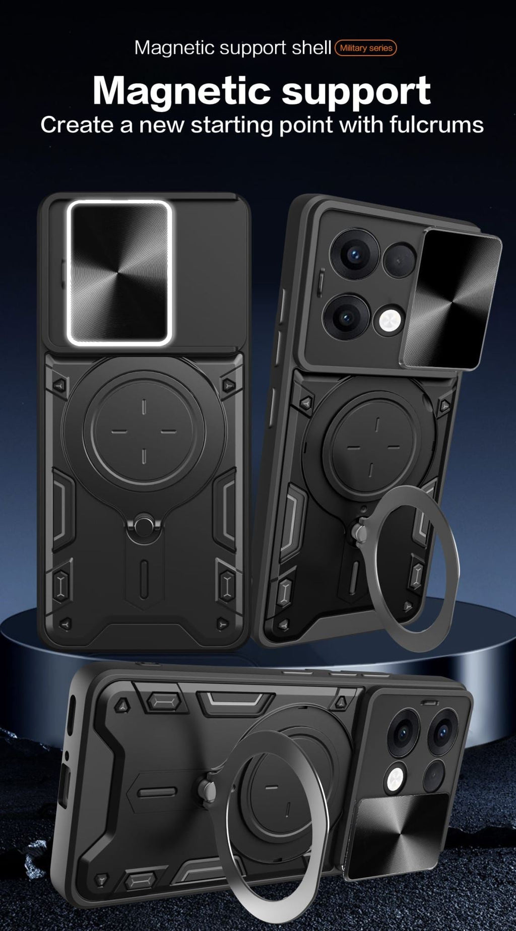 Add bold style and reliable protection to your phone with this Rugged Armor Ring Case, specially designed for the OPPO Reno 13 5G. Featuring a CD-textured sliding camera cover, built-in metal ring stand, and shock-resistant design, this case is perfect for users who need function and toughness — all in one.