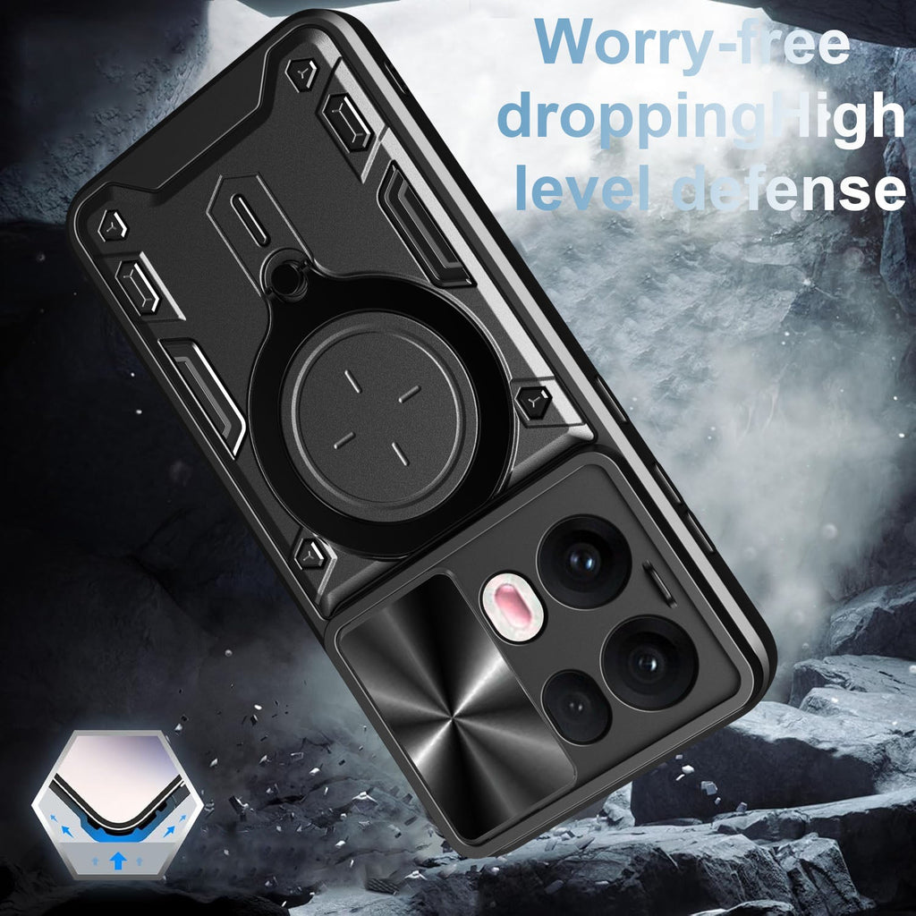Add bold style and reliable protection to your phone with this Rugged Armor Ring Case, specially designed for the OPPO Reno 13 Pro 5G. Featuring a CD-textured sliding camera cover, built-in metal ring stand, and shock-resistant design, this case is perfect for users who need function and toughness — all in one.