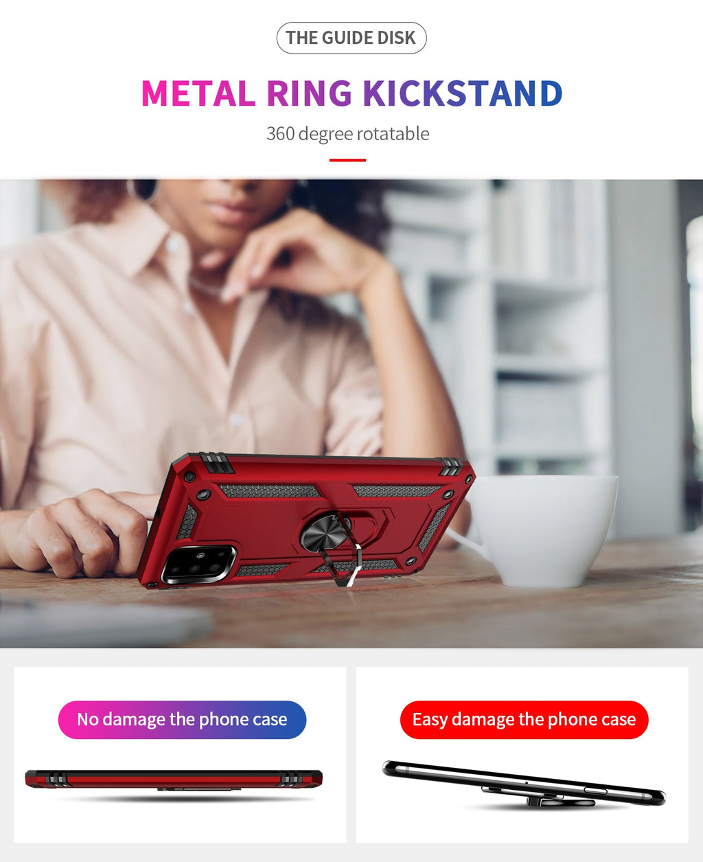 360 degree rotatable aluminum alloy ring kickstand on the Samsung A51 Case allows for the optimal viewing position