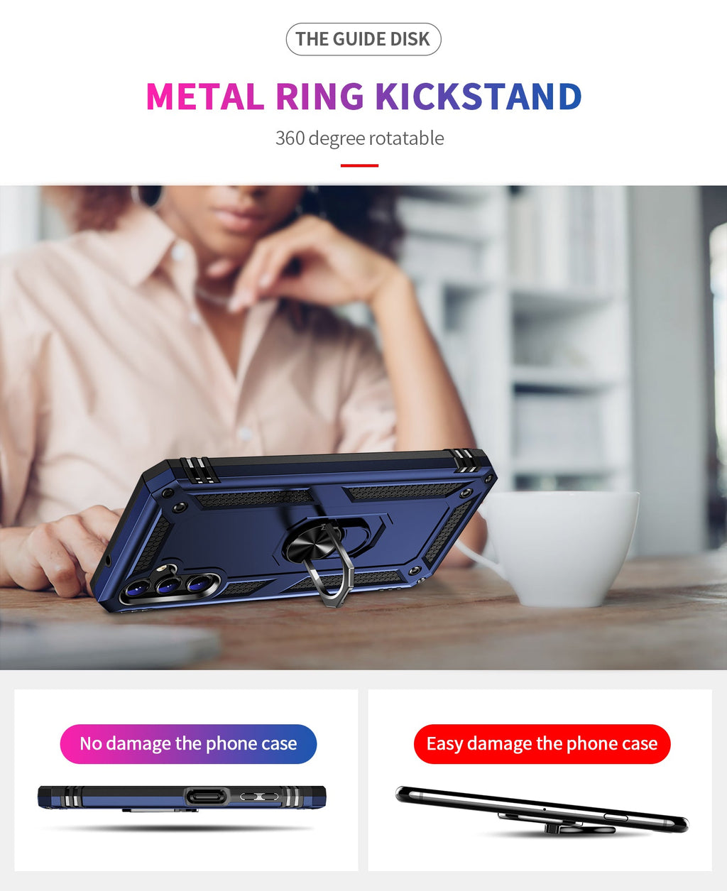 360 degree rotatable aluminum alloy ring kickstand on the Samsung Galaxy A14 Case allows for the optimal viewing position