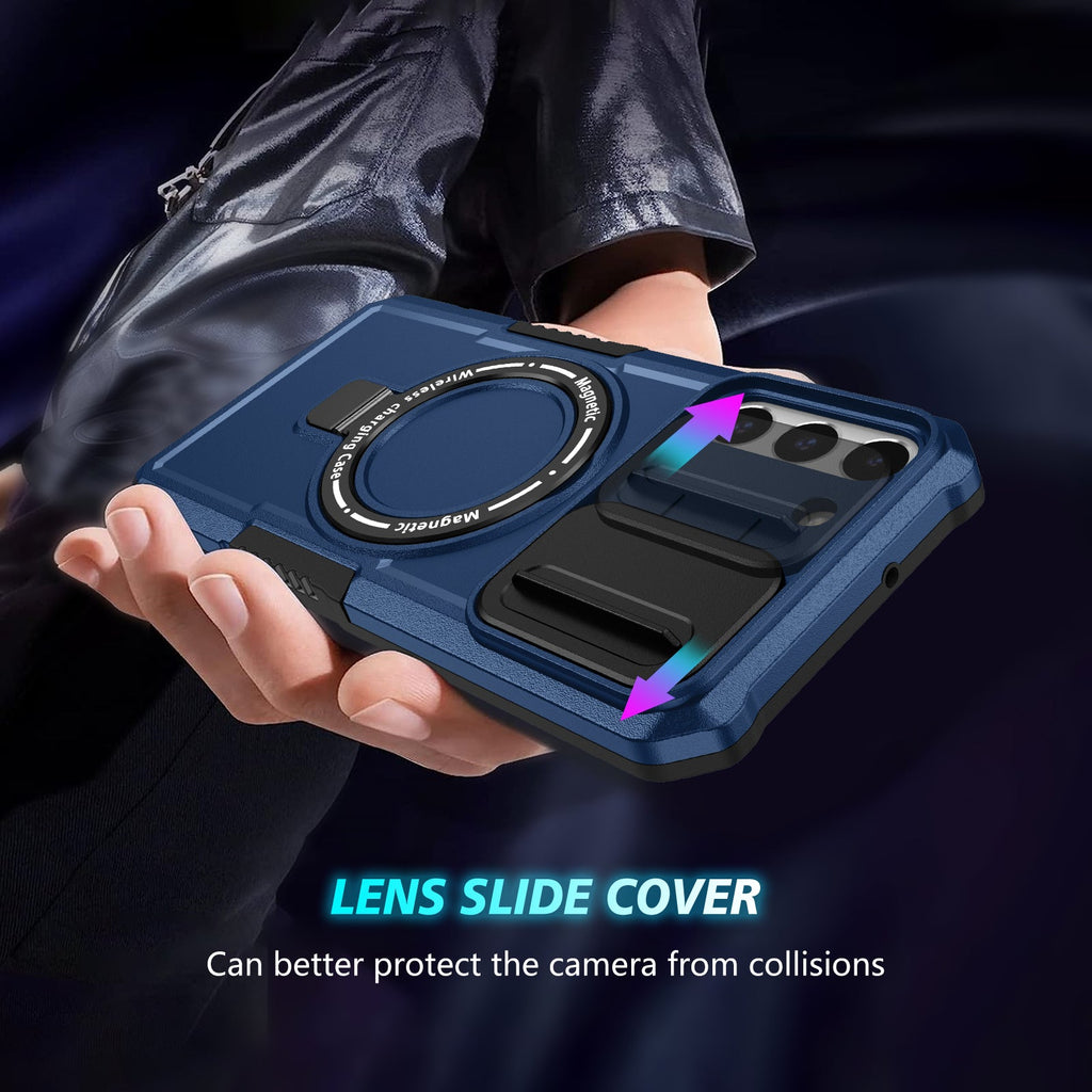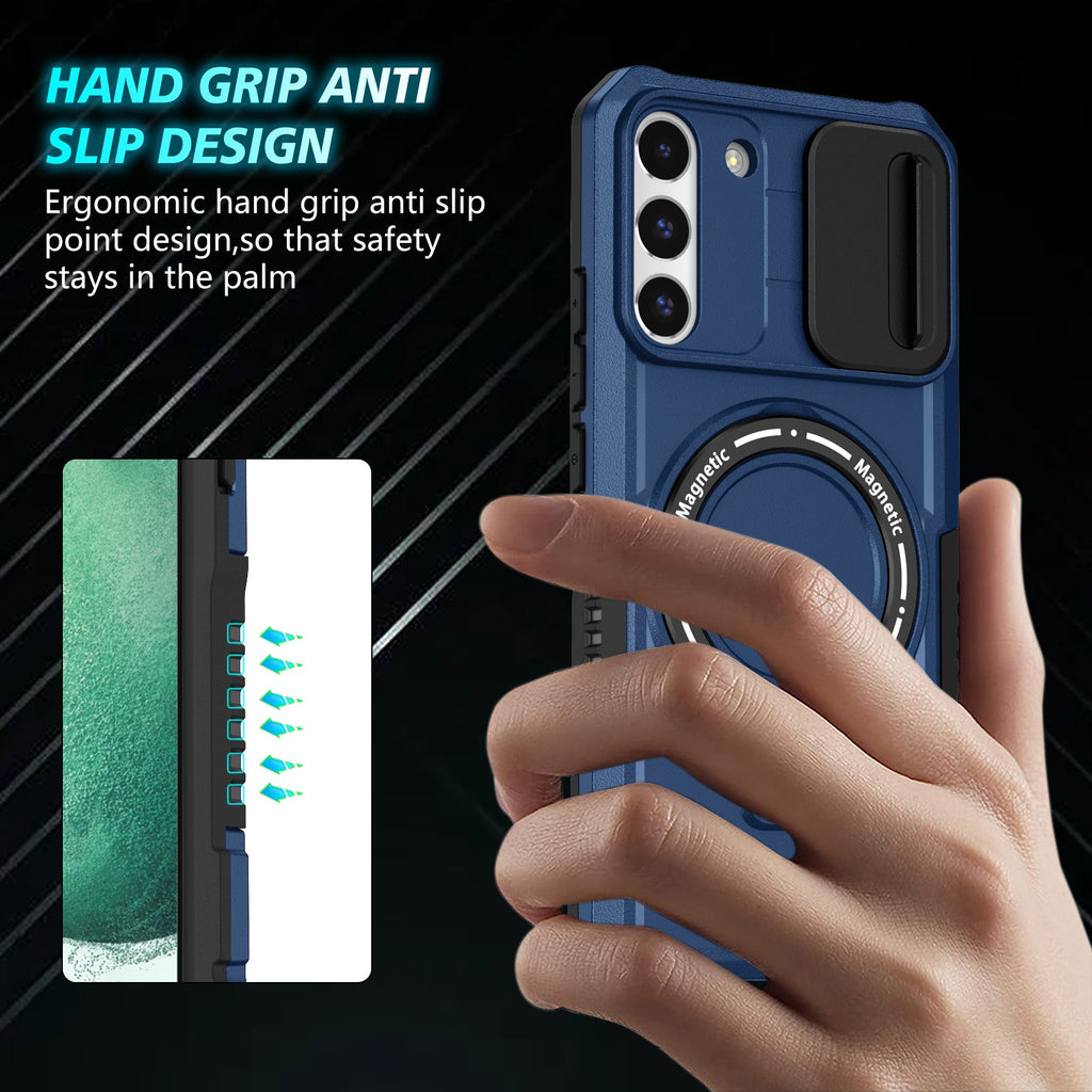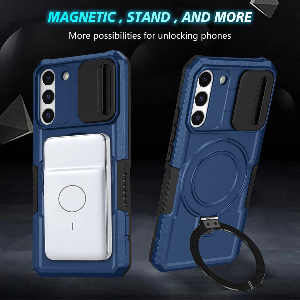 Quality MagSafe Compatible Magnetic Ring Heavy Duty Kickstand Samsung Galaxy S22+ Case with Rear Camera Sliding Cover