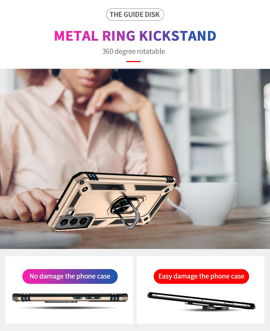 360 degree rotatable aluminum alloy ring kickstand on the Samsung Galaxy S22+ Case allows for the optimal viewing position