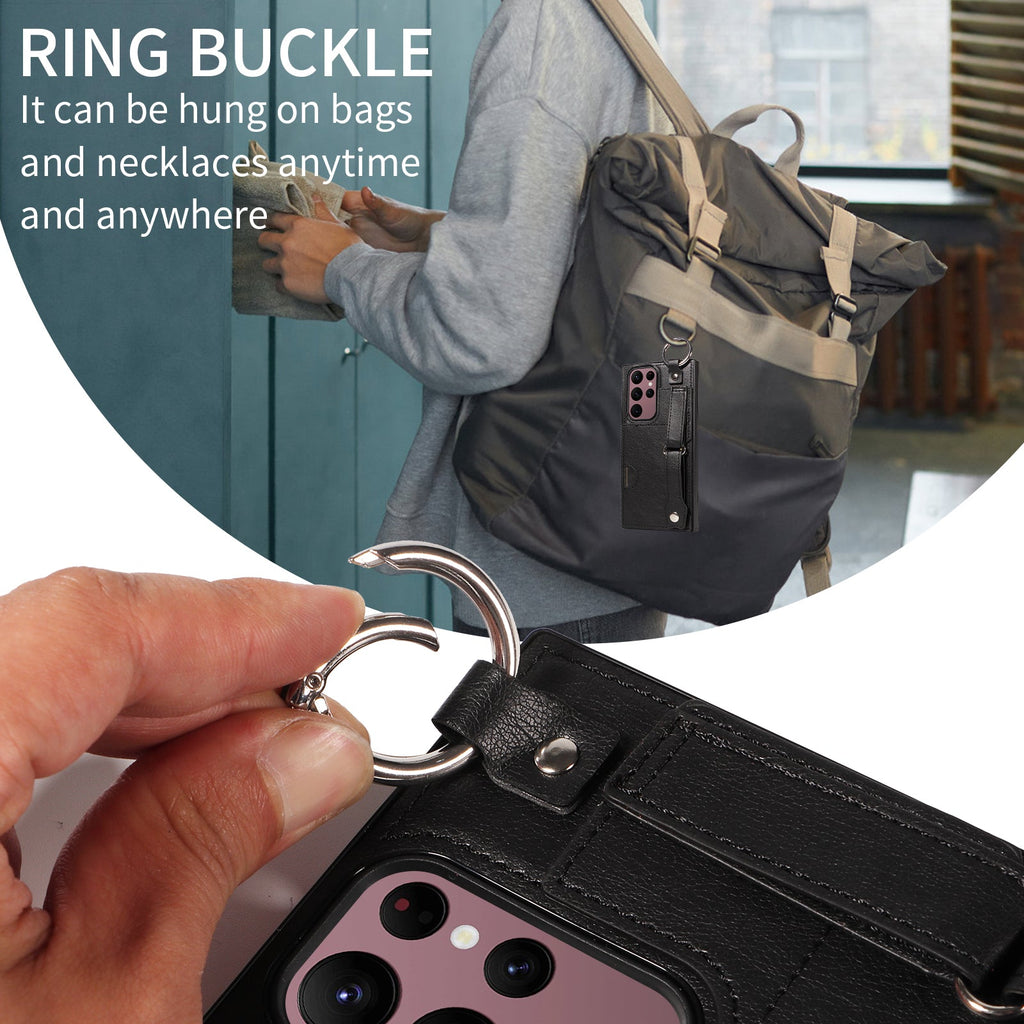 Ring buckle on the top can be used to hung the phone on bags