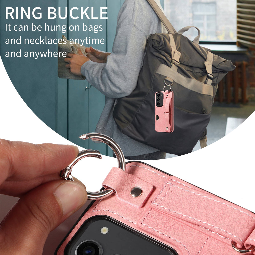 Ring buckle on the top can be used to hung the phone on bags