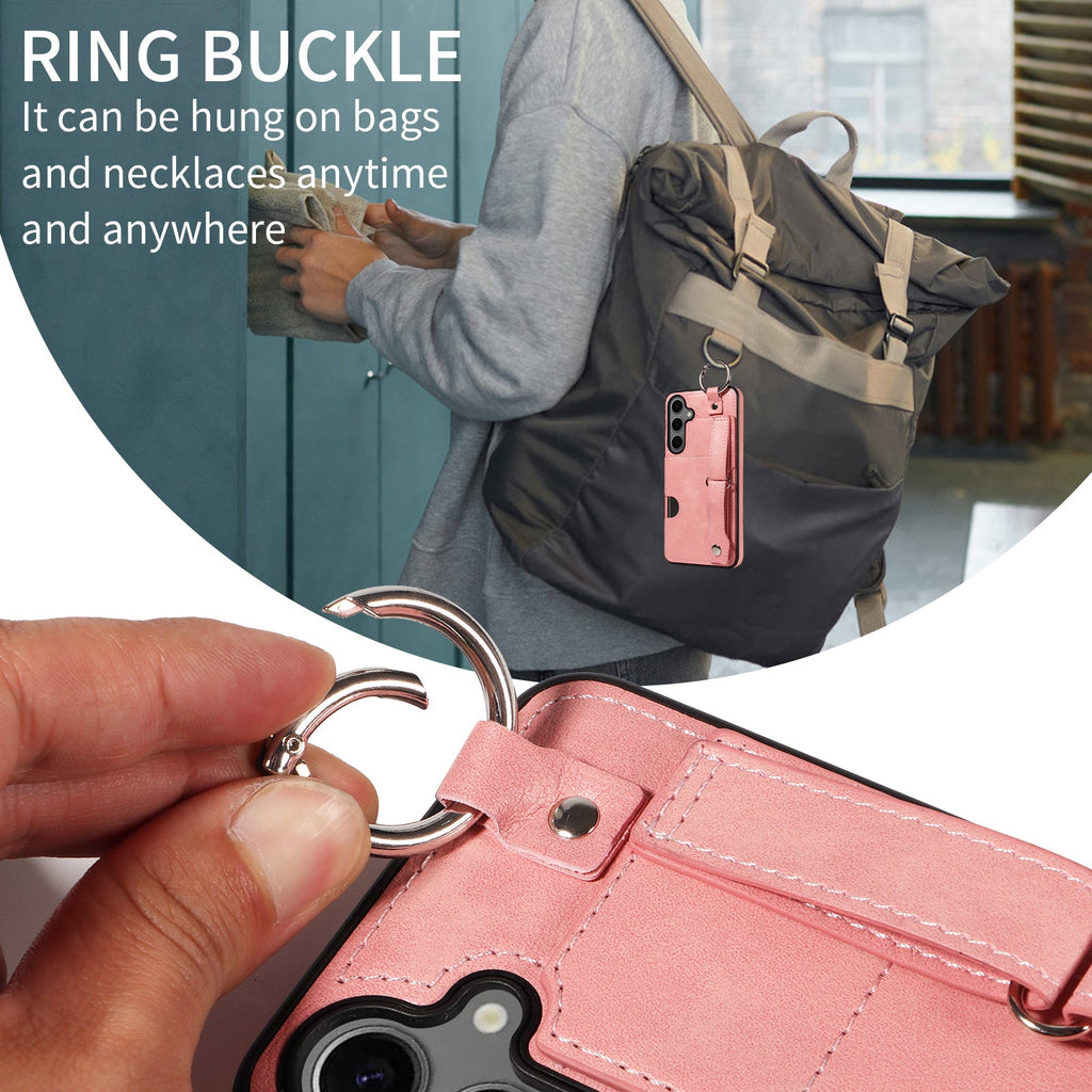 Ring buckle on the top can be used to hung the phone on bags