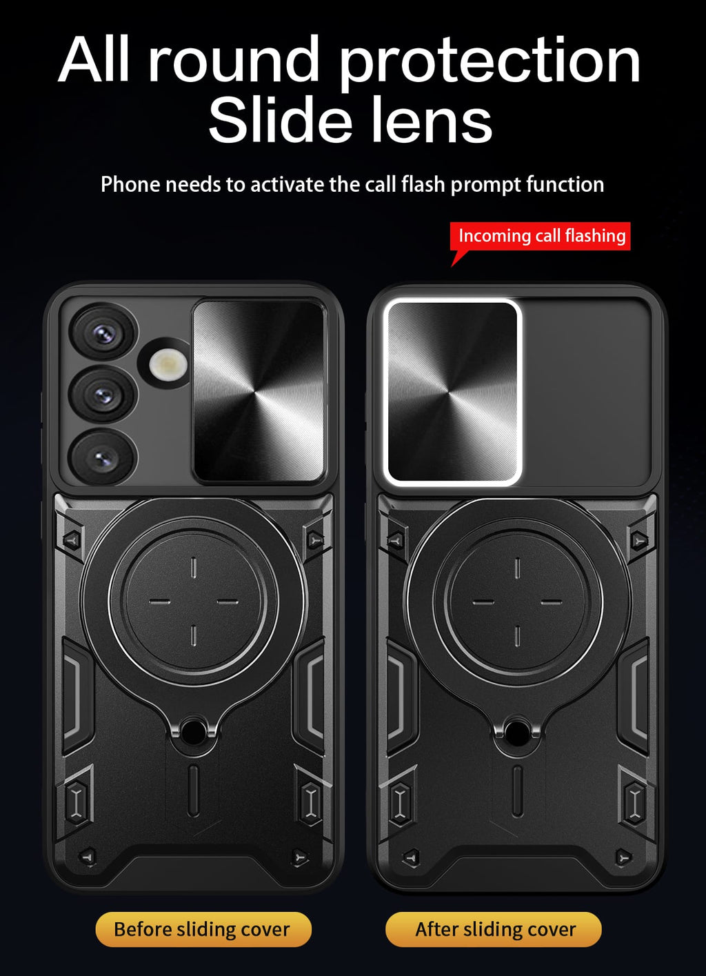 Add bold style and reliable protection to your phone with this Rugged Armor Ring Case, specially designed for the Samsung Galaxy S25FE. Featuring a CD-textured sliding camera cover, built-in metal ring stand, and shock-resistant design, this case is perfect for users who need function and toughness — all in one.