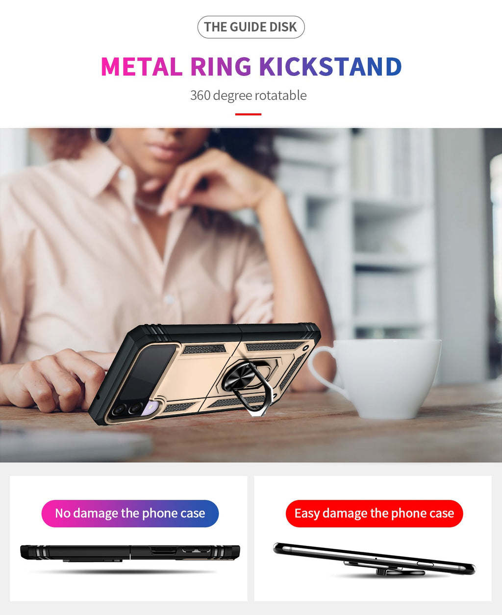 360 degree rotatable aluminum alloy ring kickstand on the Samsung Galaxy Z Flip3 5G Case allows for the optimal viewing position