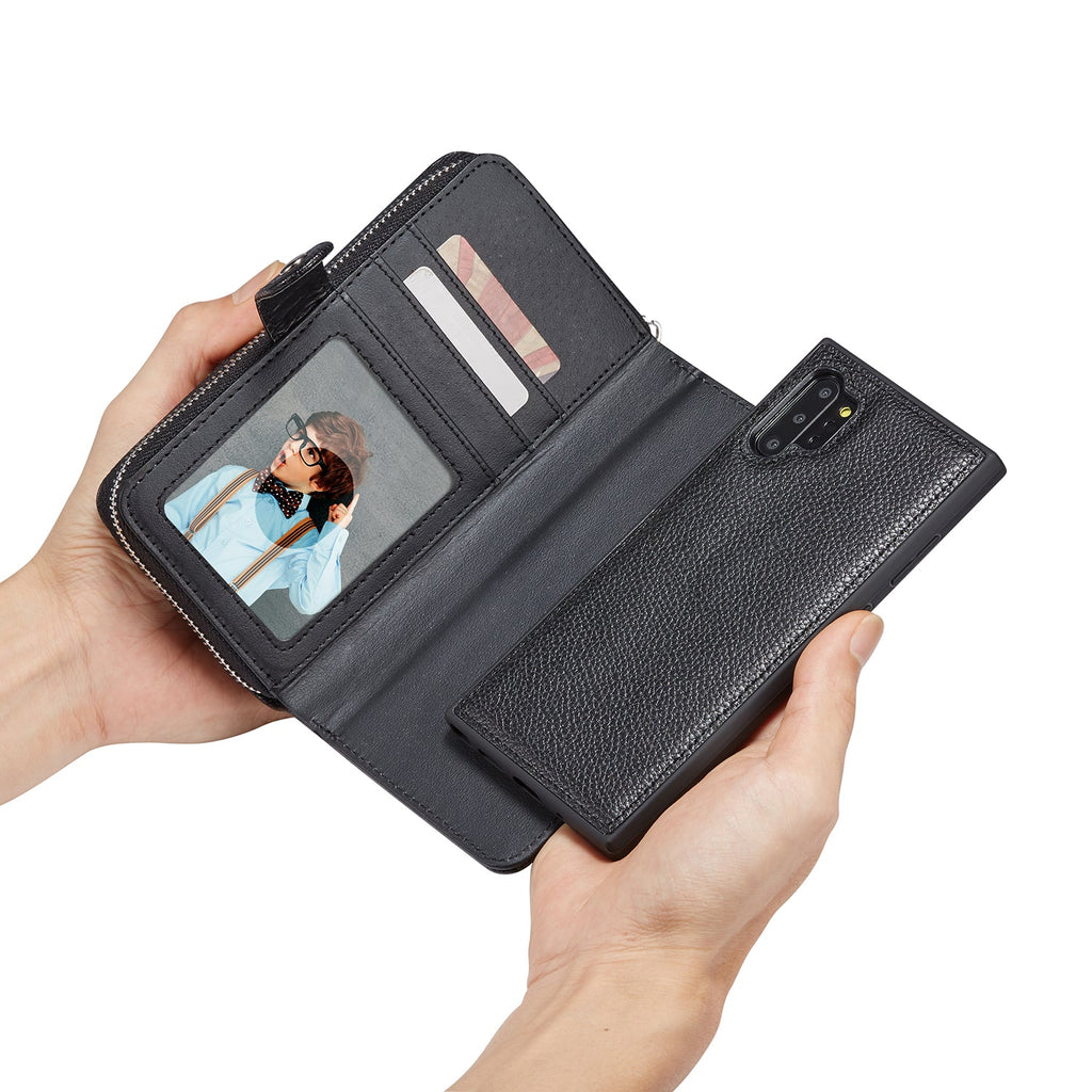 This multifunctional Samsung Note 10 Case can meet your needs in daily life. The Samsung Note 10 Case can be used as either a all-in-one wallet, or a slim detachable back case. The multiple compartments of the Samsung Note 10 Case with zipper closure can hold credit cards, cash, coins, photo etc securely.