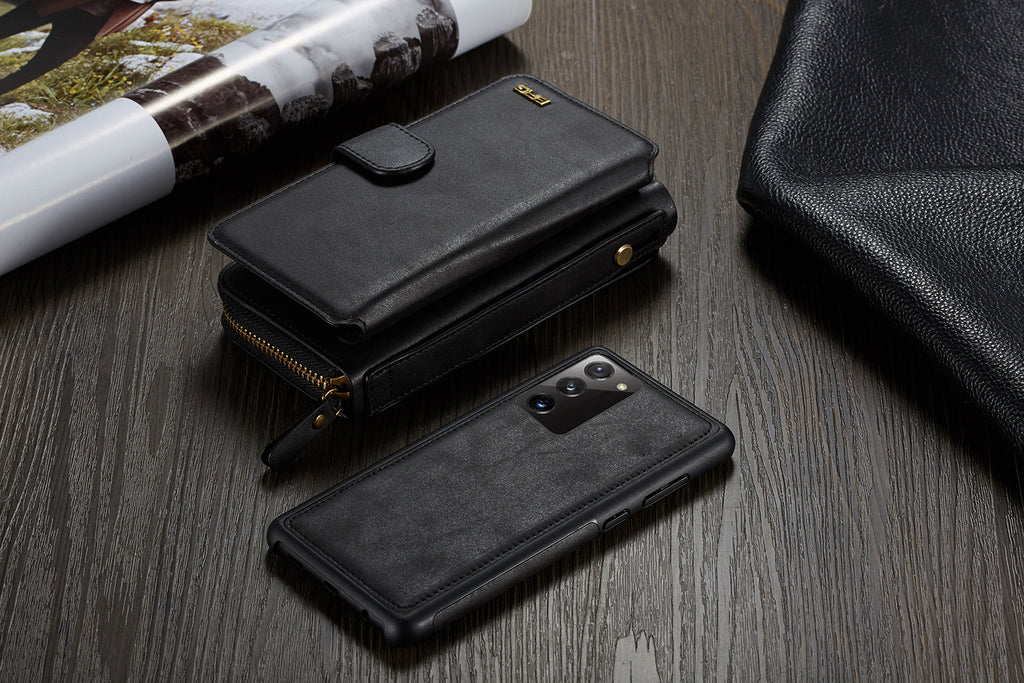 This Deluxe Zipper Handbag Wallet Samsung Note 20 Case offers 2 in 1 design and gathers a lot excellent features. The Samsung Note 20 Case can be used as either a all-in-one wallet, or a slim detachable back case. The multiple compartments with zipper closure can hold credit cards, cash, coins, photo etc securely. The Samsung Note 20 Case also has a cosmetic mirror as well as a convenient hand strap.