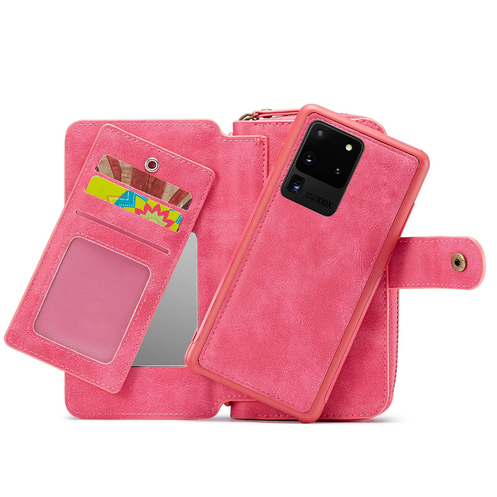 This Deluxe Zipper Handbag Wallet Samsung S20 Ultra Case offers 2 in 1 design and gathers a lot excellent features. The Samsung S20 Ultra Case can be used as either a all-in-one wallet, or a slim detachable back case. The multiple compartments with zipper closure can hold credit cards, cash, coins, photo etc securely.