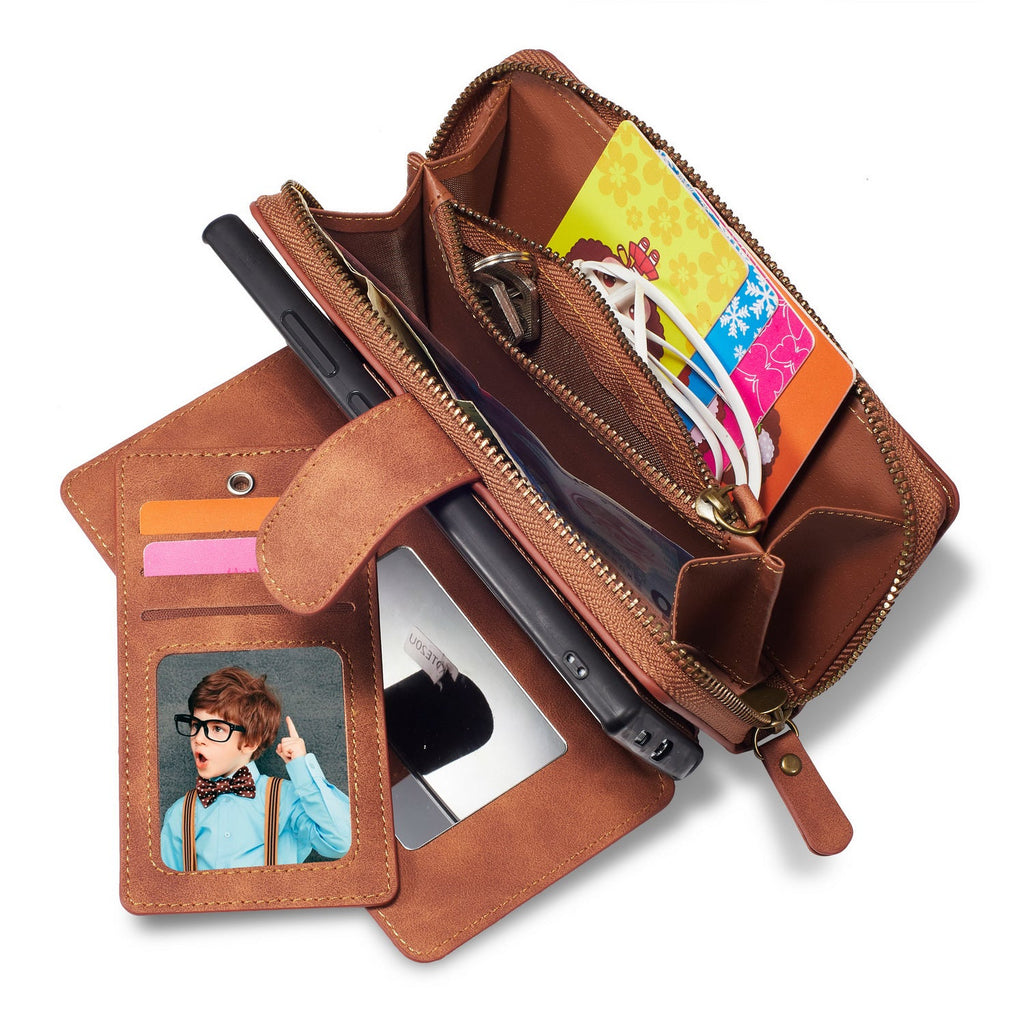 This Deluxe Zipper Handbag Wallet Samsung S21 Case offers 2 in 1 design and gathers a lot excellent features. The Samsung S21 Case can be used as either a all-in-one wallet, or a slim detachable back case. The multiple compartments with zipper closure can hold credit cards, cash, coins, photo etc securely. The Samsung S21 Case also has a cosmetic mirror as well as a convenient hand strap.