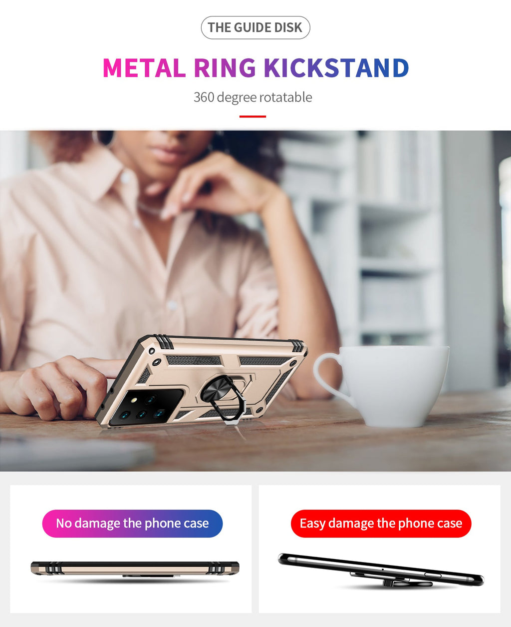 360 degree rotatable aluminum alloy ring kickstand on the Samsung S21 Ultra Case allows for the optimal viewing position