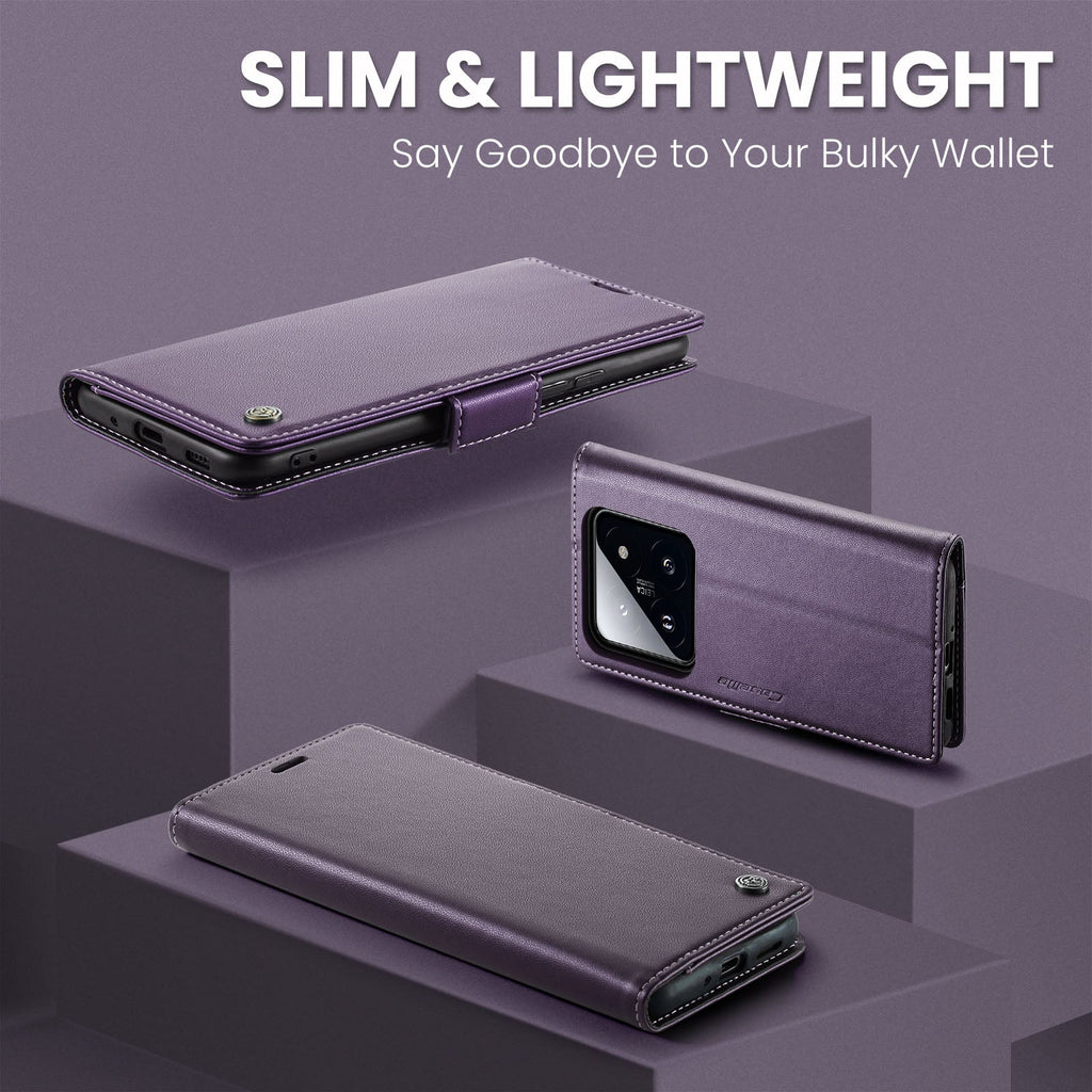 Stylish wallet designed for Xiaomi 14. Crafted with stylish PU leather material, this Xiaomi 14 Case adds a deluxe look to your device.