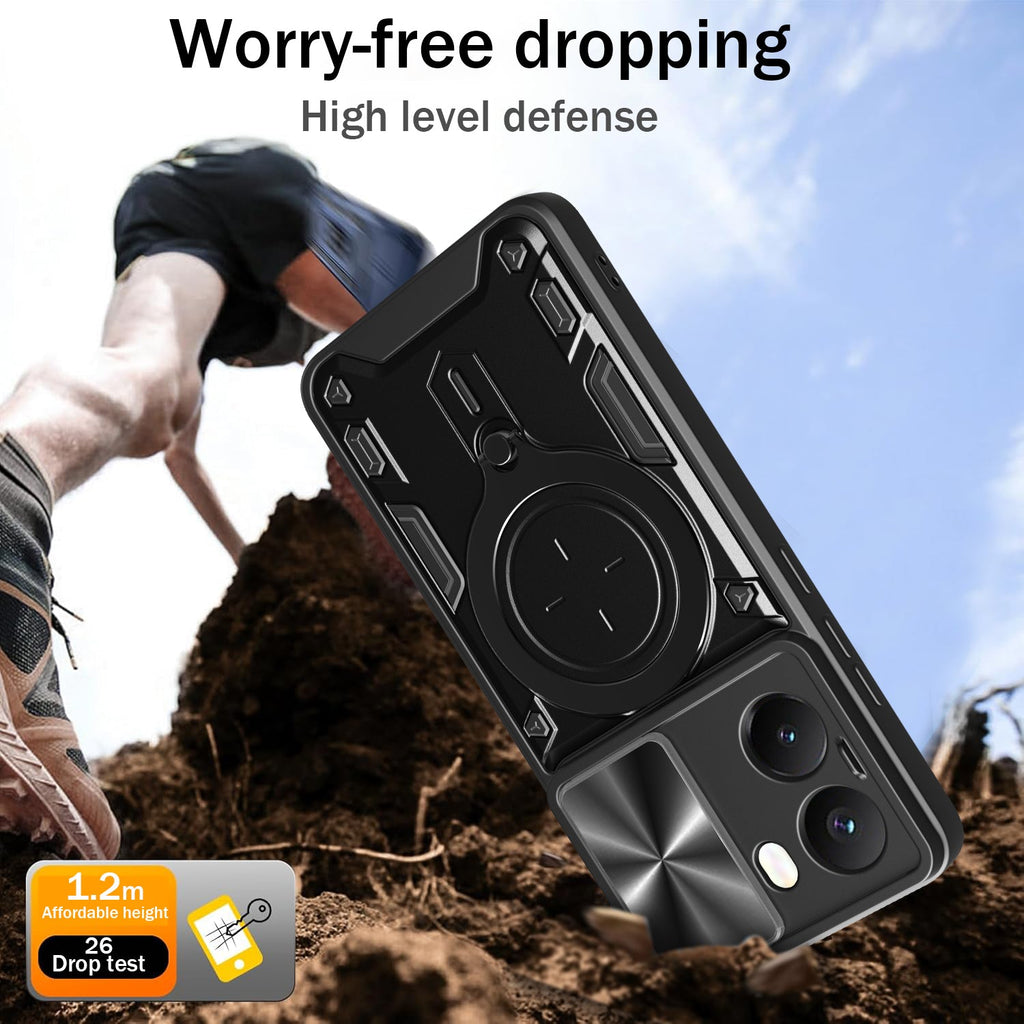 Add bold style and reliable protection to your phone with this Rugged Armor Ring Case, specially designed for the Xiaomi Poco X7 Pro. Featuring a CD-textured sliding camera cover, built-in metal ring stand, and shock-resistant design, this case is perfect for users who need function and toughness — all in one.