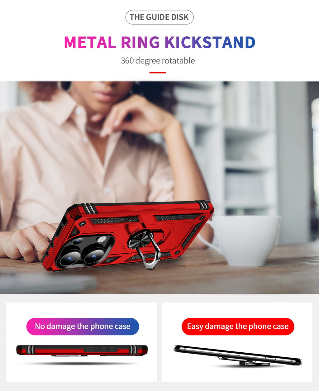 360 degree rotatable aluminum alloy ring kickstand allows for optimal viewing position